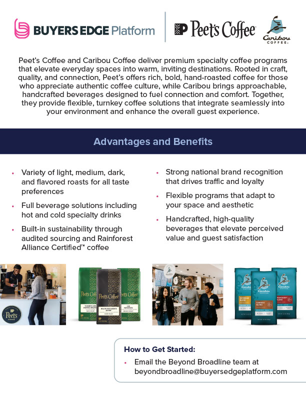 As a Source1 client, you can access exclusive pricing and add Peet’s Coffee to your operation to provide fresh, high-quality coffee to your customers. Submit a form to request more information and get a free coffee sample.