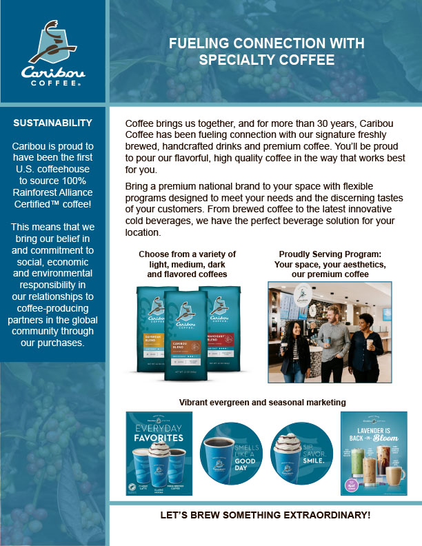 Peet’s Coffee and Caribou Coffee stand as two trusted premium brands, boasting over 90 years of roasting heritage and a shared dedication to responsible sourcing, focusing exclusively on the top 1% of Arabica beans. The Peet’s Program offers a comprehensive suite of support, including equipment, service, account management, training and core marketing.